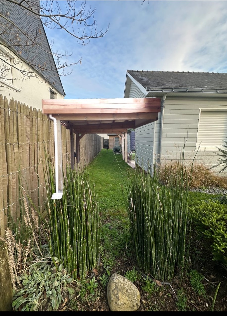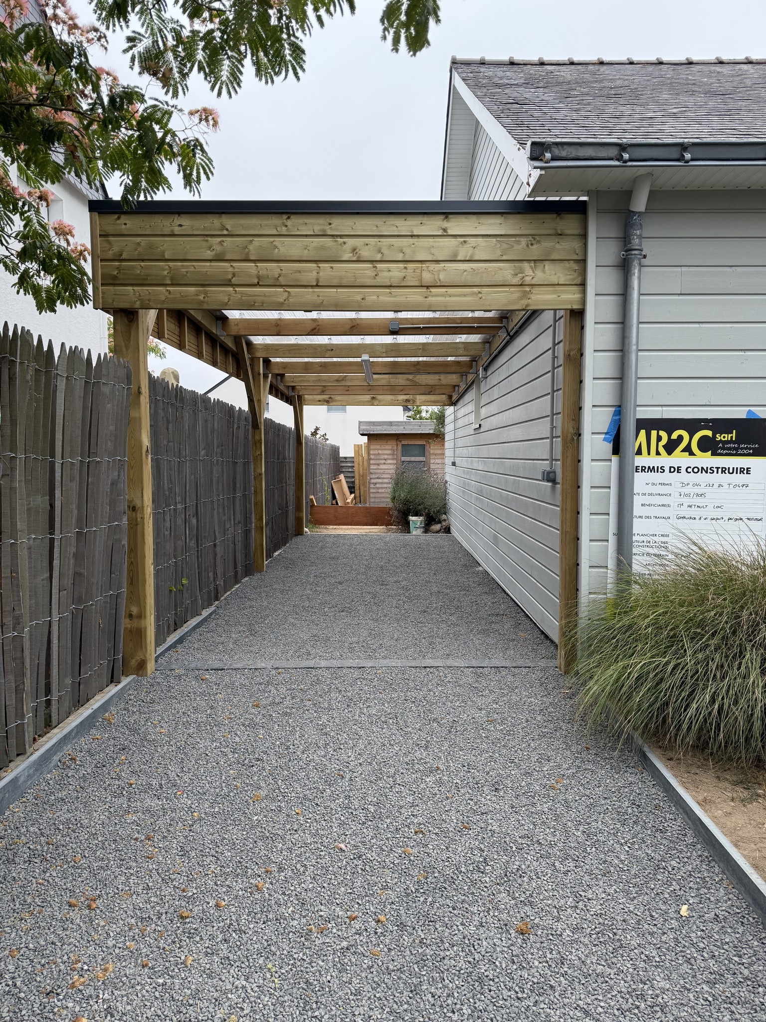 Un simple chemin…devenu un espace structuré, pratique et esthétique grâce à la pose d’un carport bois et gravier en Nidagravel 💡
